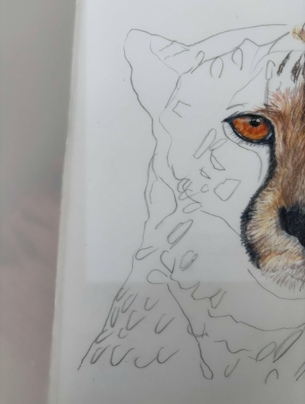 To begin, I created a simple graphite sketch to ensure all the features were in the correct place. This step is so important for a realistic pet portrait. If the proportions are even slightly off, the entire piece can feel wrong. As I move on to the color, I carefully rub out the graphite from each section using a Tombow or Putty eraser.