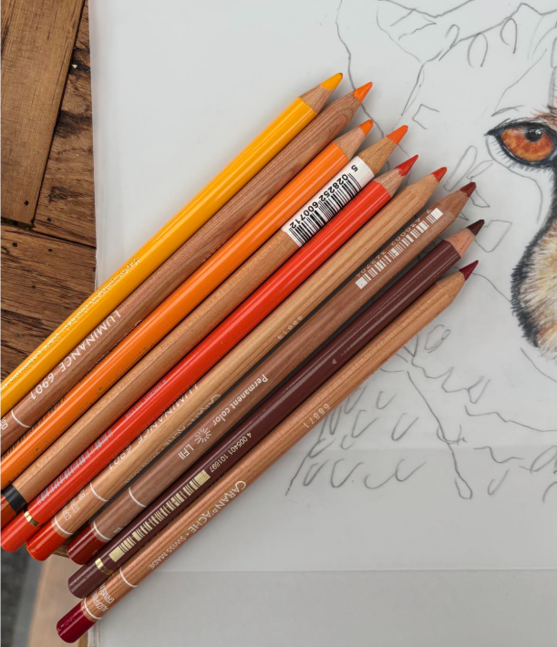 I used a variety of shades, including Dark Cadmium Yellow, Orange, and Caput Mortum from the Polychromos range; Cornelian and Crimson Alizarin from Luminance; and Flame from Derwent Lightfast. I used Polychromos Dark Indigo and Black for the pupils and surrounding areas.